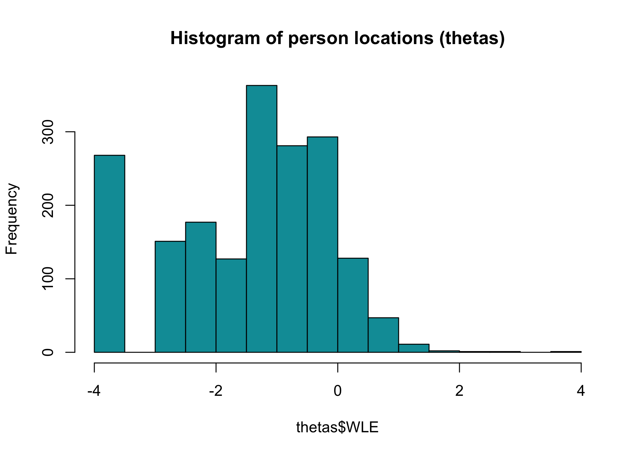 We can take a look at the distribution of person locations (thetas) using a histogram.