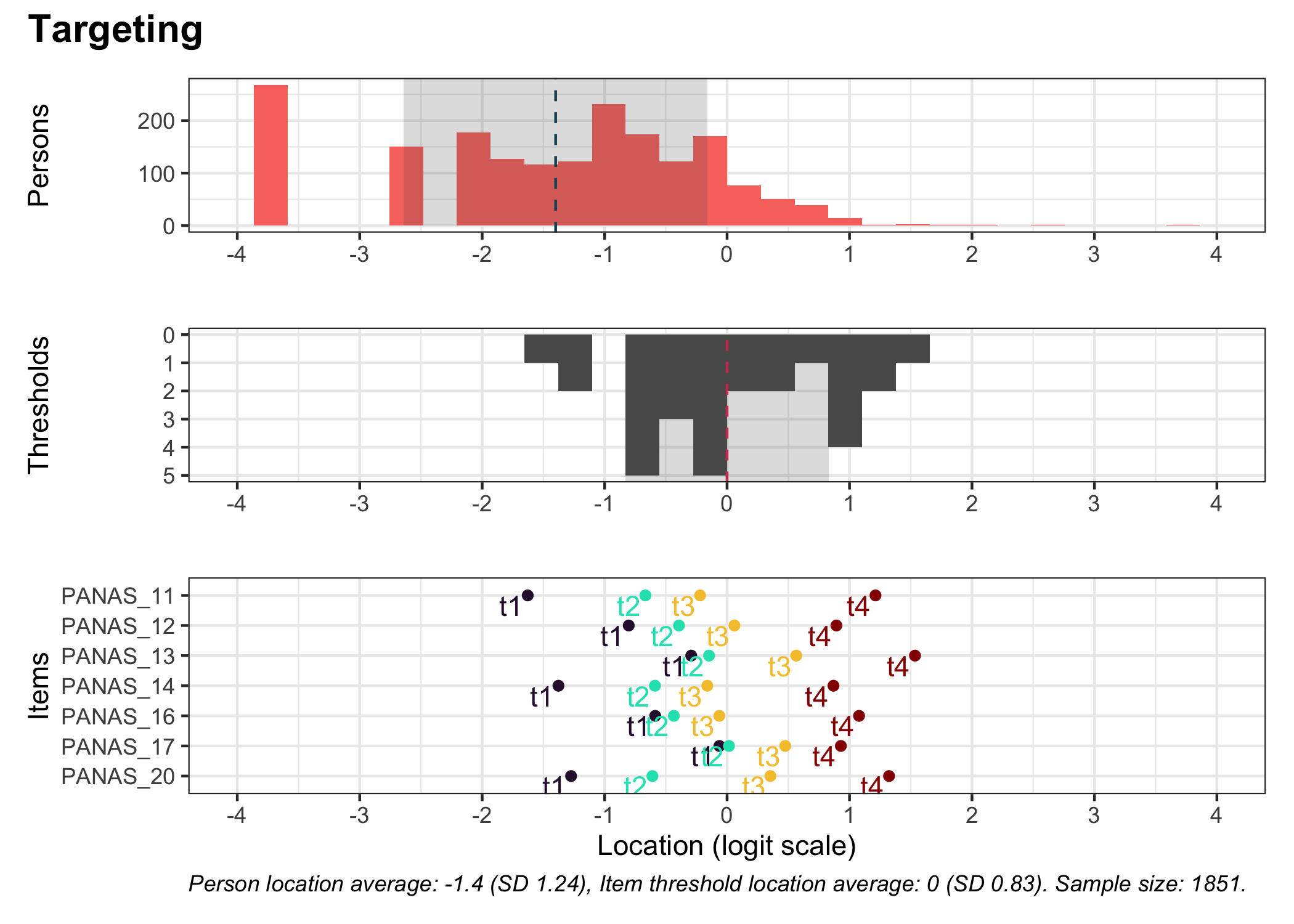 As of package version 0.1.30.0, the `RItargeting()` function allows more flexibility in styling too, by having an option to return a list object with the three separate plots. See the [NEWS](https://github.com/pgmj/easyRasch/blob/main/NEWS.md#01300) file for more details. Since the `RItargeting()` function uses the `patchwork` library to combine plots, you can also make use of [the many functions that `patchwork` includes](https://patchwork.data-imaginist.com/articles/patchwork.html). For instance, you can set a title with a specific theme: